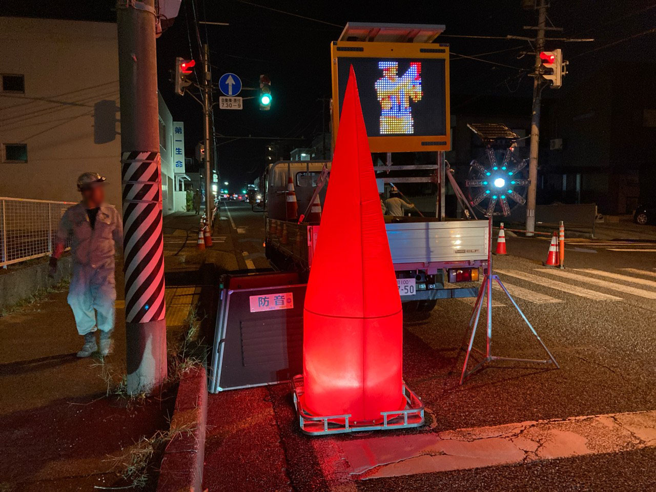 作業中は片側交互通行規制をしていますので、車両の通行にはご注意をお願いいたします。また、騒音・振動には細心の注意を払っておりますが、